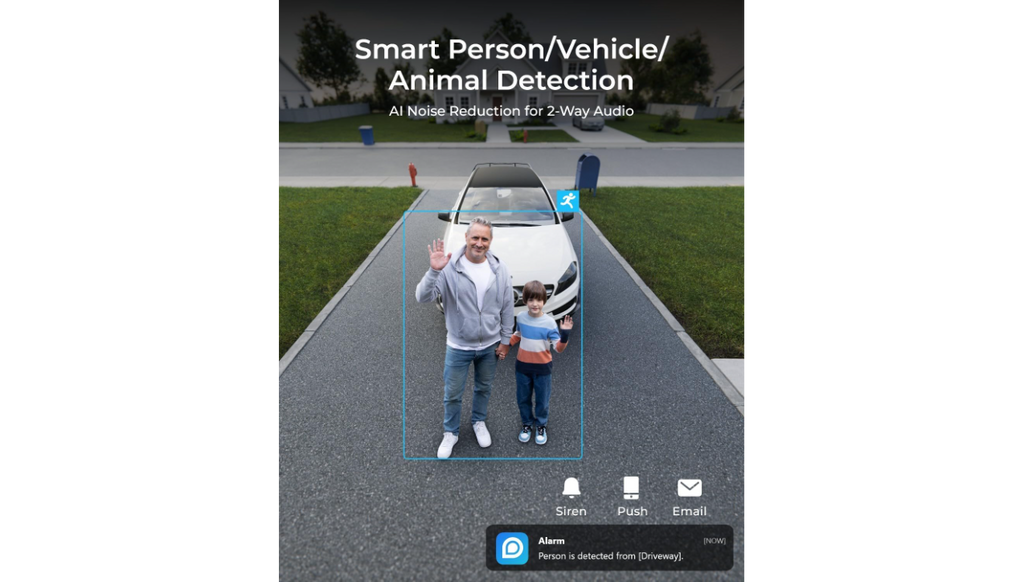 Smart Detection - Accurately detect people, vehicles, and animals amidst other objects and send real-time alerts to you. Additionally, when swiftly passing cars or other targets are detected, the camera can take snapshots and send them to your email/FTP server.