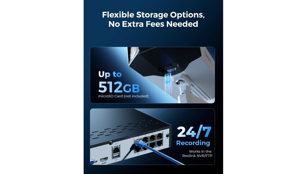 Versatile Storage Options, Secure & Convenient - Reolink Duo 3 PoE supports 24/7 continuous, motion-triggered, or scheduled recording. Store footage on a microSD card, Reolink NVR, or FTP server, all ensuring your privacy and control over stored data. With the H.265 video coding format, enjoy high-quality recordings in reduced file sizes, maximizing storage space without compromising quality.
