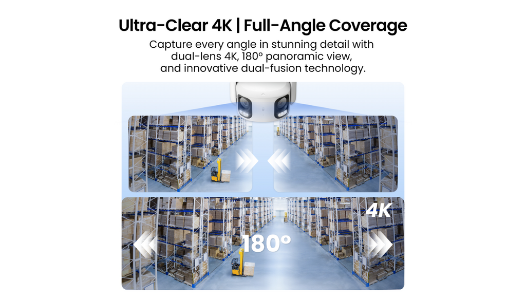 Experience ultra-clear 4K resolution with a panoramic 180° dual-lens view. Enjoy distortion-free, wide-angle coverage with no blind spots. The large F1.6 aperture enhances night vision, ensuring detailed color footage even in low light.