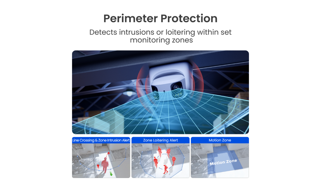 - Perimeter Protection with 30m Infrared Night Vision and Spotlights for Color Night Vision - Equipped with AI-driven Line Crossing Alert, Zone Intrusion Alert, and Zone Lingering Alert, this pro-grade camera delivers precise 24/7 protection for critical areas, enabling rapid response to security threats.